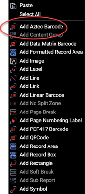 Add a AztecBarcode layout element to a report by right-clicking anywhere in a page or report and selecting Add Aztec Barcode from the context menu.