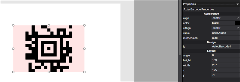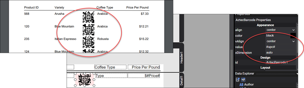 Of course, Designer's true power lies in dynamically generated reports, and barcodes are no exception. The AztecBarcode layout element allows dynamically specifying the value property as a JSON data field name surrounded by pounds, for example, #upc#.