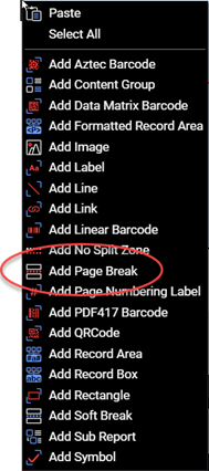 Figure 2. Select Add Page Break to add a PageBreak.