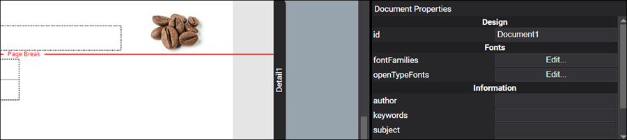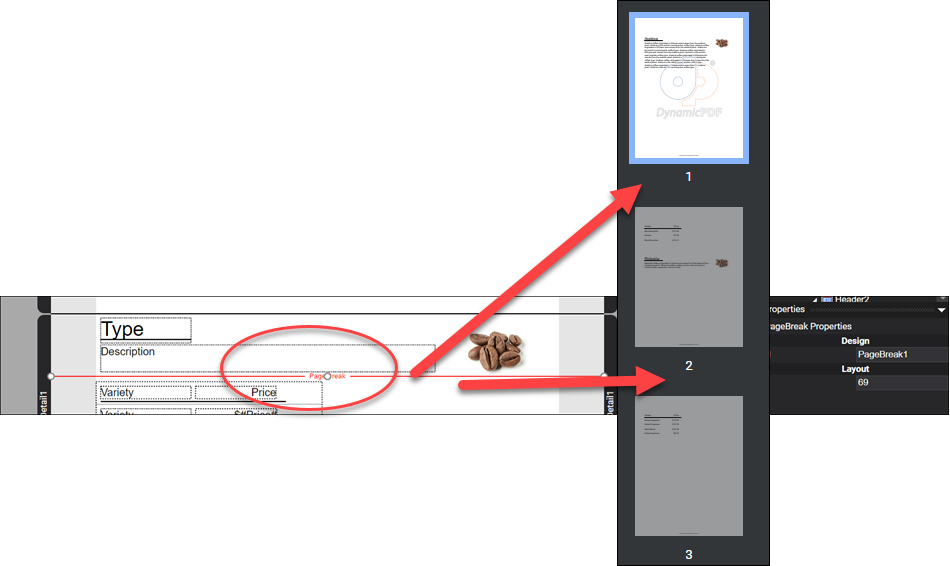 The PageBreak layout element forces a Detail section to create a new page at the specified Y coordinate.