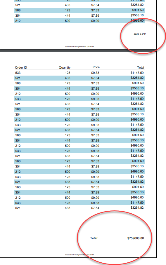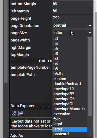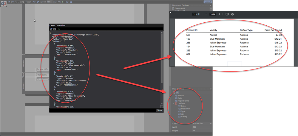 A report, must contain one or more data elements in a JSON dataset. Typically, a report's data consists of one or more array elements, where each element in the array corresponds to a row in the produced PDF.