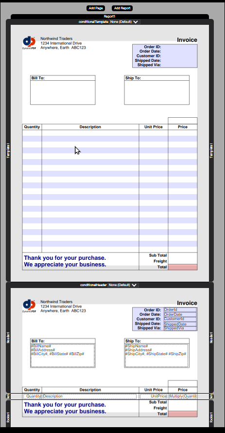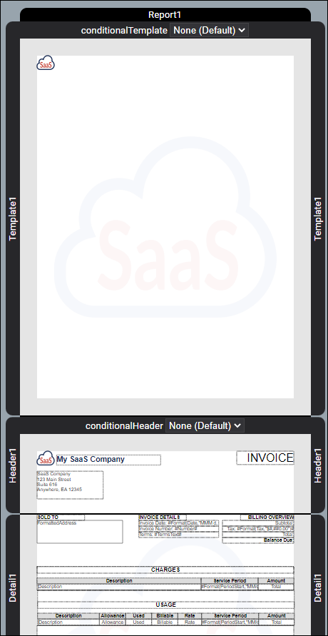 In general, a report template will display on every page. However a conditional template will only appear on a report’s page when a certain predefined condition is satisfied. If the condition is not satisfied then the default template will be displayed on that page of the report.
