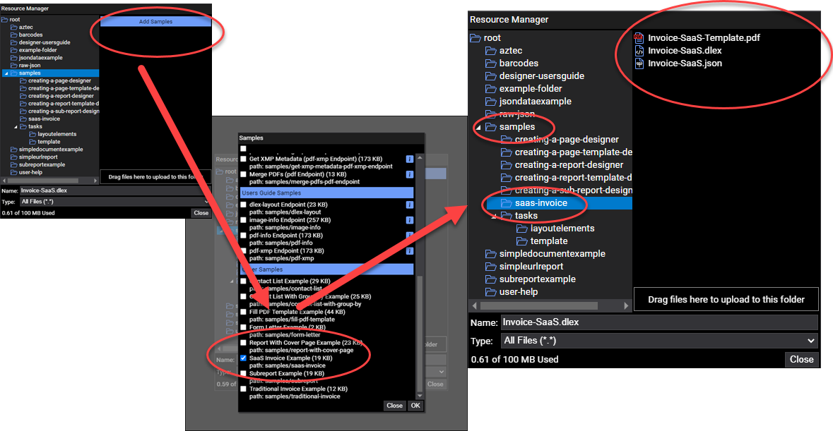 For example, the example project, saas-invoice (available from the Samples folder in the File Manager), illustrates a Report with a template.