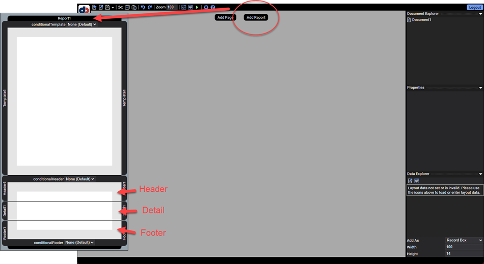A report consists of a header, detail, and footer section. The header and footer, like a page, contain top-level non-repeating JSON fields, while the detail section contains repeating data fields that comprise the report's content.