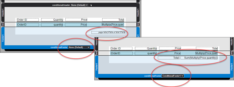 Headers and footers that appear in a report only when certain predefined conditions are satisfied are known as a Conditional Header or Conditional Footer. By default, every report has one header and footer (called the Default) that appears on every report page. In situations where you only wish to display a header/footer if certain conditions are met, you create a Conditional Header/Conditional Footer. If these conditions are not satisfied, then the default header or footer is displayed.