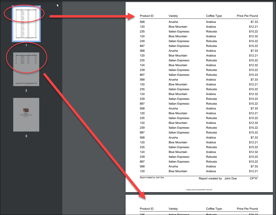 Figure 3. A report's JSON array row elements correspond to rows in the produced PDF report.