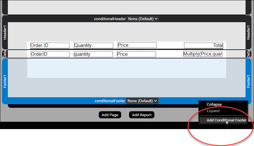 To add a Conditional Header or Conditional Footer, expand the header or footer section of the report, right-click and select the Add Conditional Header or Add Conditional Footer from the context menu. This adds a new tab in the header/footer area.