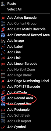Figure 1. Adding a RecordArea layout element using the Add Record Area option in the context menu.